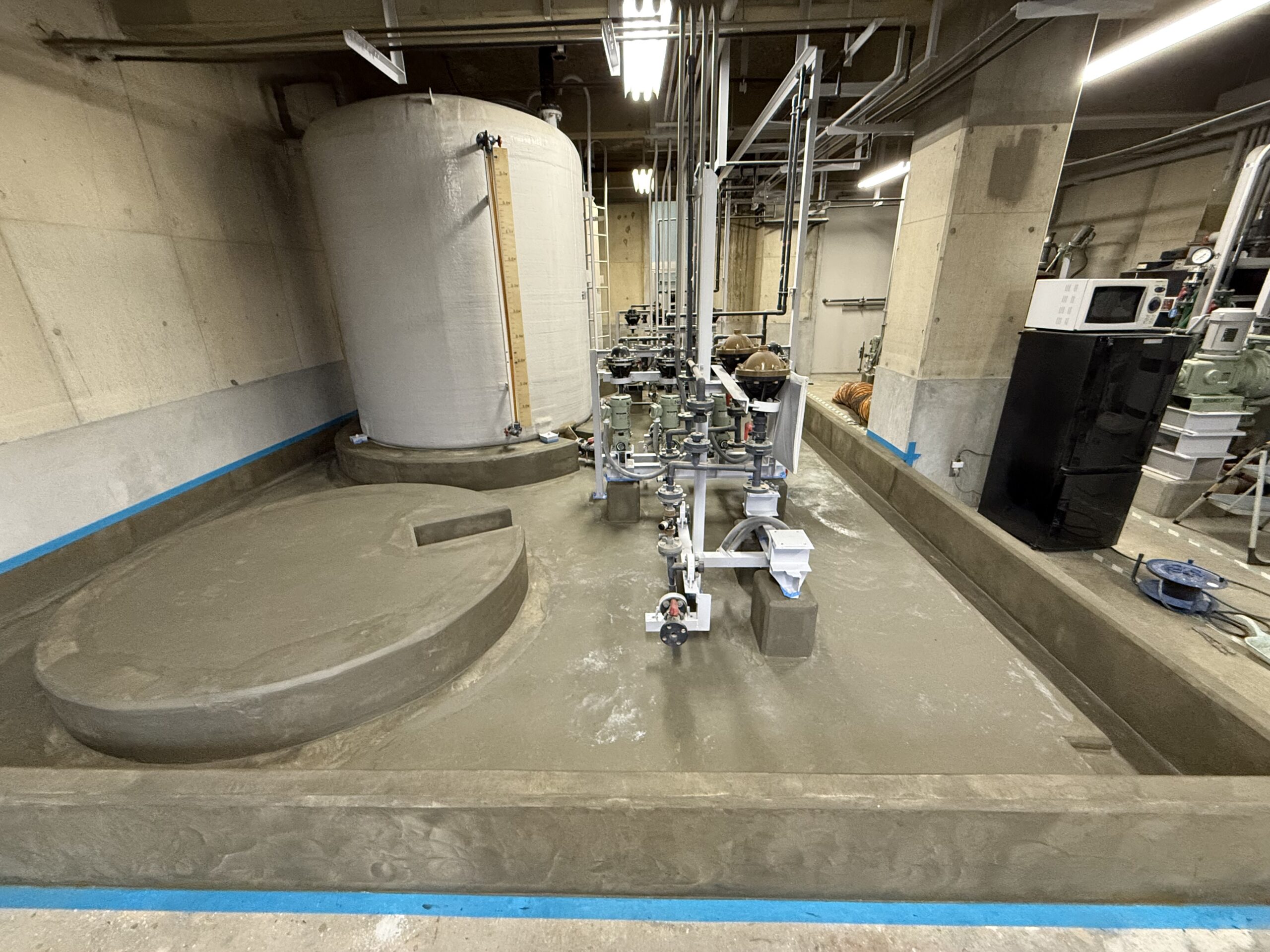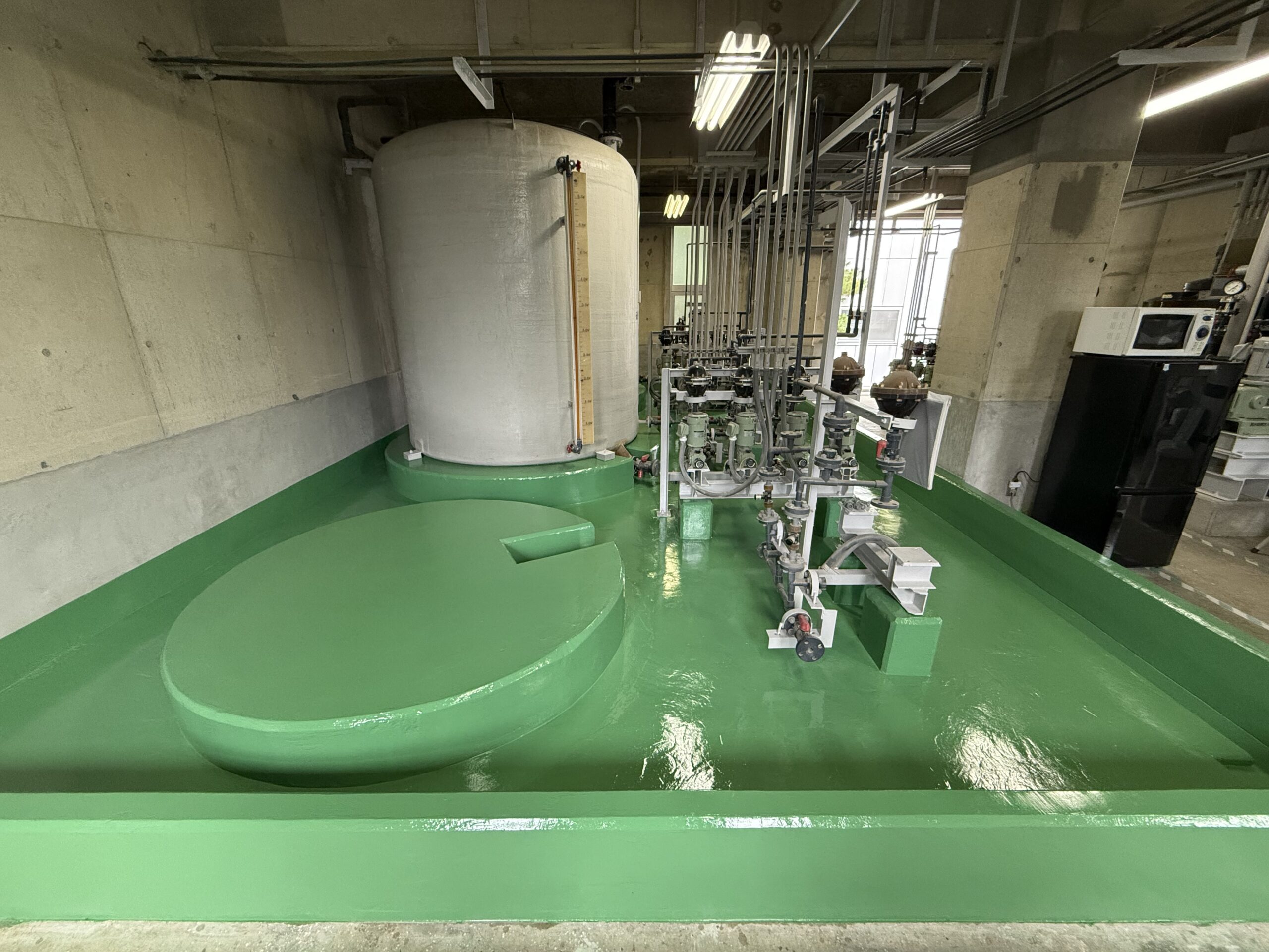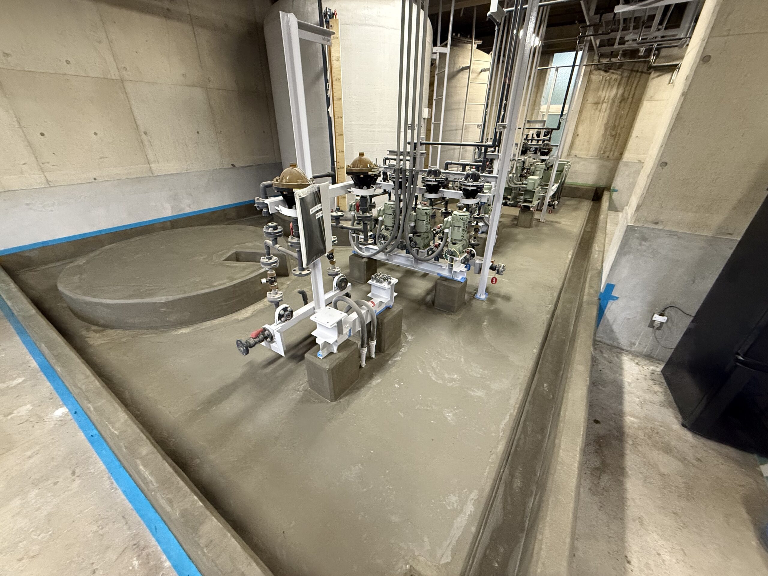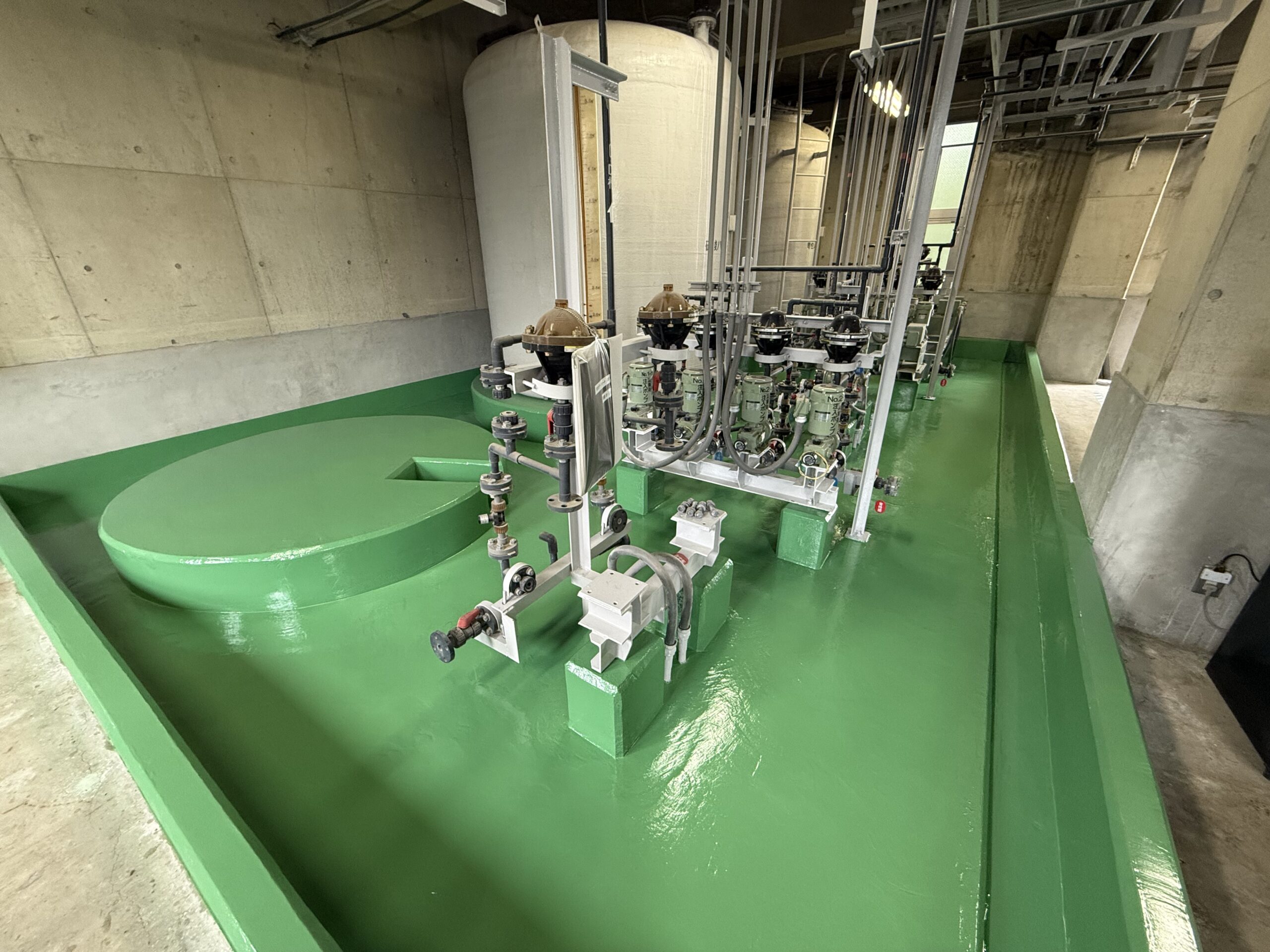 耐薬品塗装工事 第4汚水処理場2F防液堤内面改修工事 2024年10月 滋賀県栗東市 防液堤内面の改修工事になります。旧塗膜の全面撤去及び、ひび割れ処理、欠損部処理、下地調整工(エポキシ樹脂系ポリマーセメントモルタル)、耐薬品塗装まで施工させていただきました。